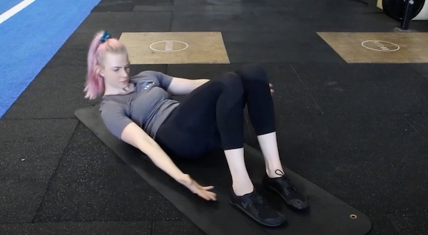 Ankle taps are a low-impact ab exercise that you do by lying down on the floor and reaching out to tap your ankles with your hands. [ID: ankle_taps]
