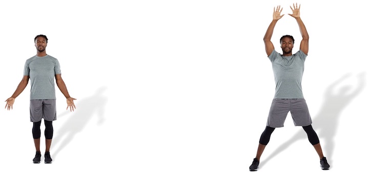 When performing jumping jacks as a dynamic warm-up, the goal is to slightly elevate heart and respiration rates without causing undue fatigue. [ID: jumping_jacks]