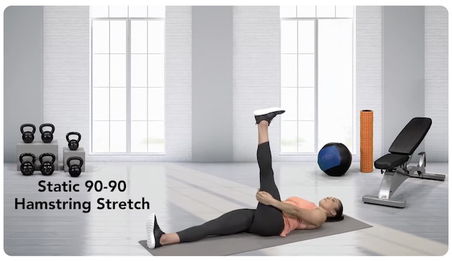 VeryWellHealth: "This exercise is good for beginners who have trouble touching their toes or who have stiffness in the hamstrings." [ID: lying_hamstring_stretch]