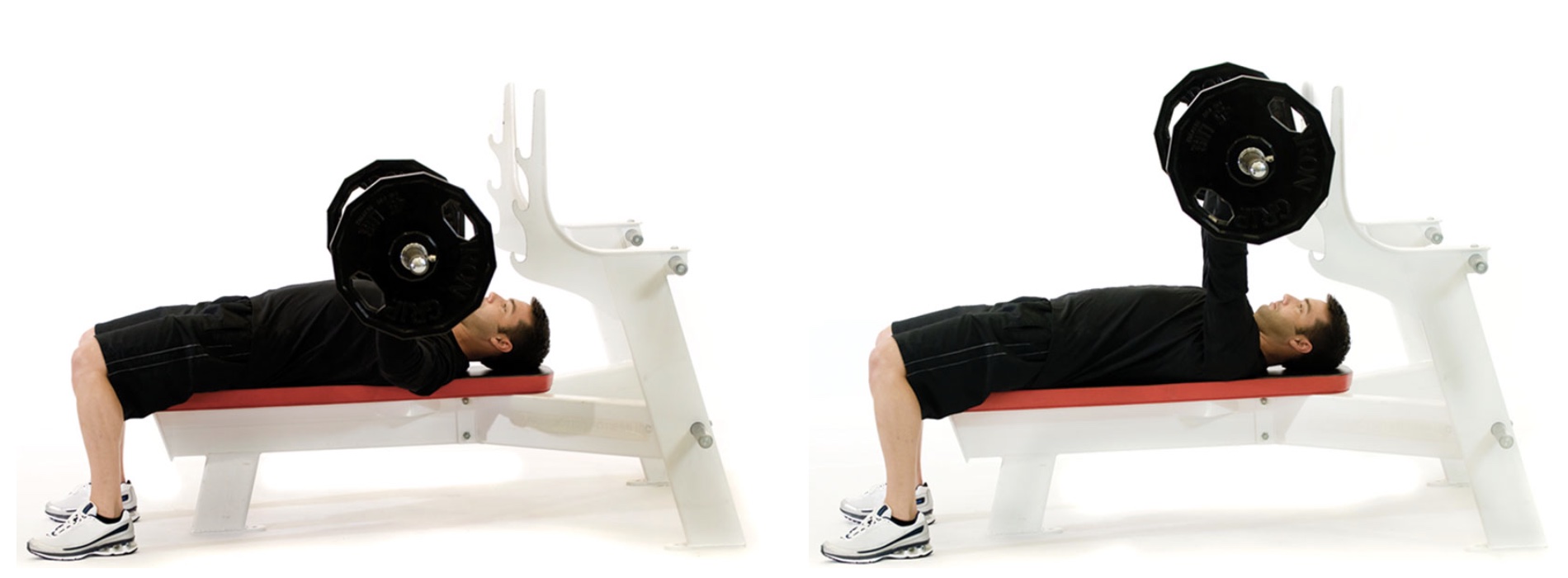 Description: During this exercise, the feet should remain in contact with the floor, whereas the buttocks, shoulders, and head must remain in contact with the bench. The use of weight plates underneath the feet is acceptable if the client cannot reach the floor, due to height limitations. [ID: chest05]