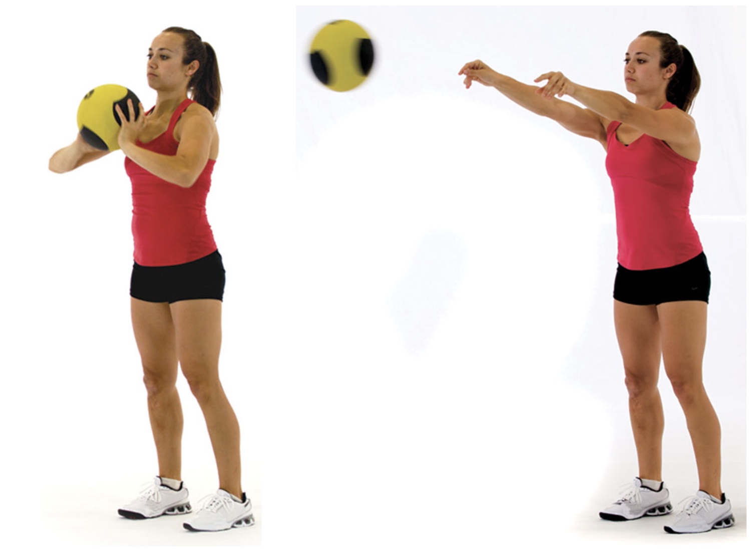 Description: If the ability to perform power exercises with a medicine ball is not an option, because of equipment or facility limitations, this exercise can also be done using tubing or a cable apparatus. Make sure to adjust the weight or resistance accordingly, so the client can still perform the movement quickly and under control without compensation. [ID: chest06]