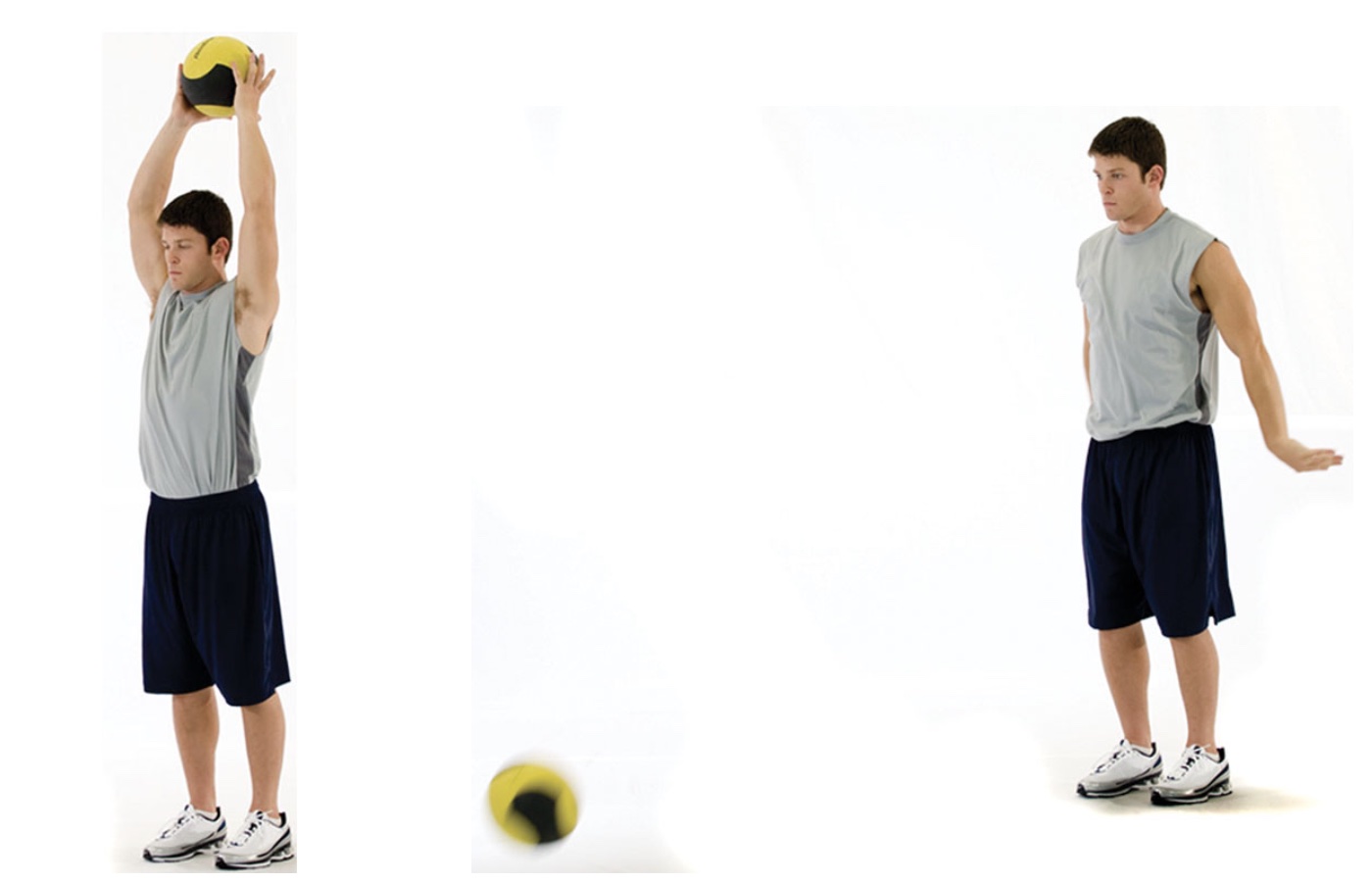 It may be easier to perform this exercise using a D-ball (a medicine ball that does not bounce back) or close to a wall to bounce the medicine ball off.