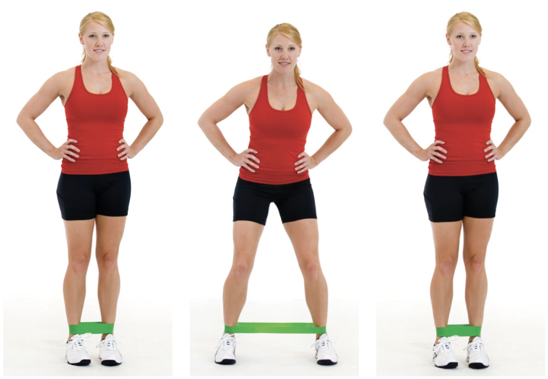 Description: Place elastic tubing around the knees, maintain a quarter squat position, and sidestep for the desired number of repetitions in each direction. Make sure the knees are tracking in line with the second and third toes. Do not allow the knees to cave inward. This exercise primarily targets the hip abductors, such as the gluteus medius. The band can also be placed around the ankles (as shown) as a progression to this exercise. [ID: dynamic04]