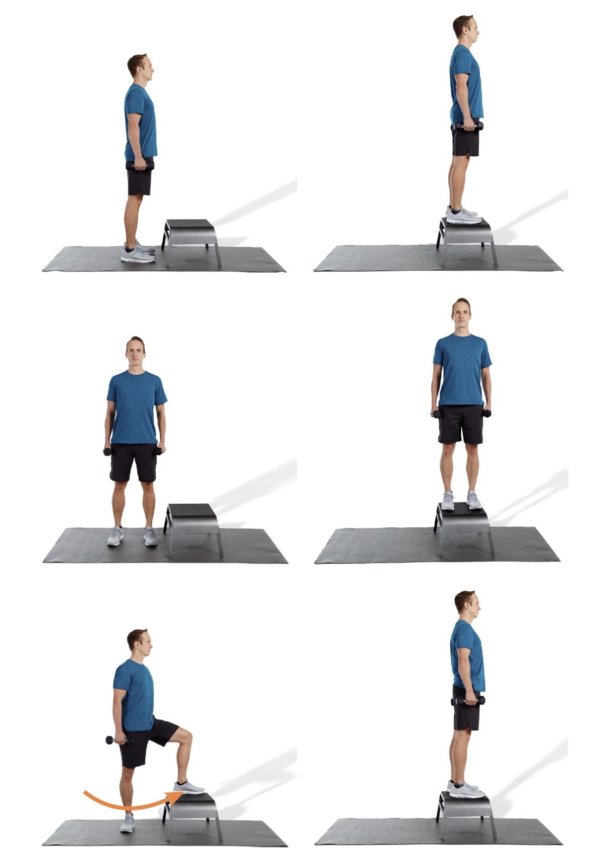 Description: Lunges are excellent lower extremity strengthening exercises; however, many individuals lack the flexibility and stabilization requirements to execute the exercise properly. Step-ups are a great way to regress the lunge until your client develops proper flexibility and stabilization capabilities to perform the lunge correctly. [ID: leg05]