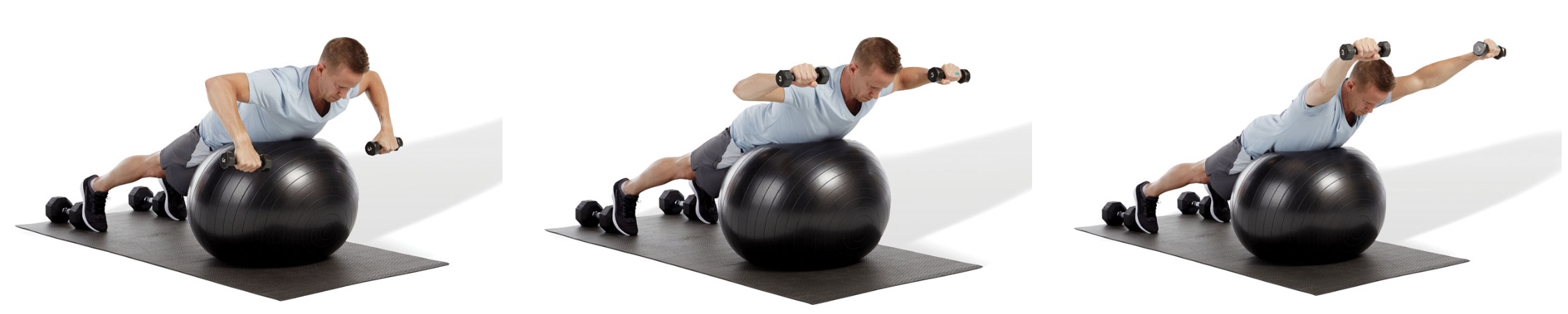 Description: Like ball combo I, this exercise also consists of three parts: a dumbbell row, shoulder external rotation, and a prone shoulder press. [ID: shoulder05]