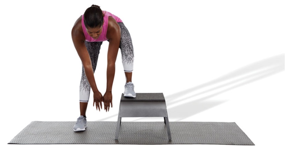 While standing with one foot on a bench or plyo box, reach down to a comfortable position without excessively rounding the spine until a stretch is felt.