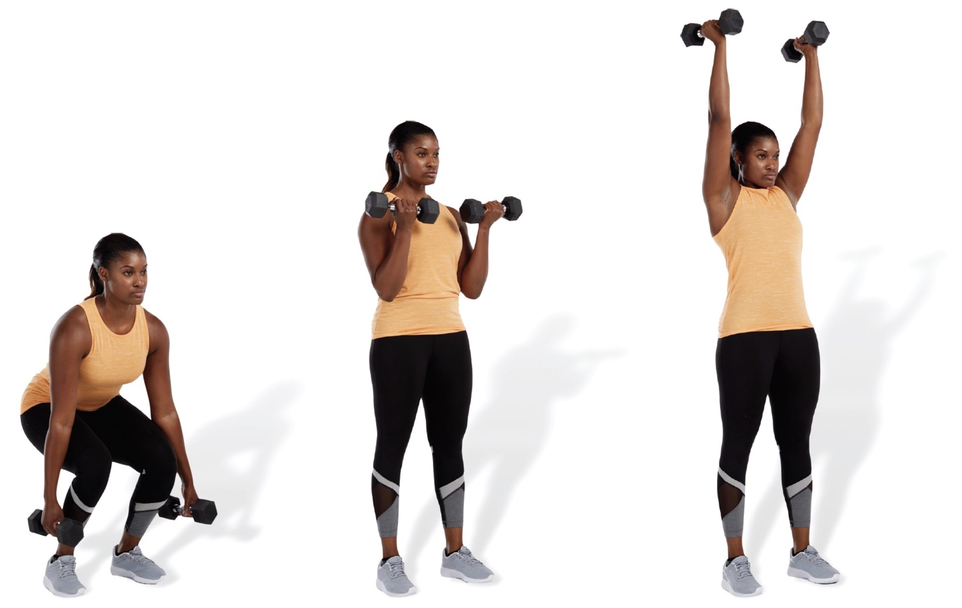 Description: Choose a load that enables the client to perform the biceps curl and overhead press with ideal form. The upper body will likely fatigue before the lower body when performing this exercise. [ID: totalbody06]