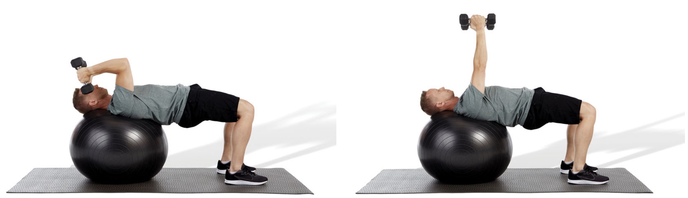Description: When performing stability ball exercises in a supine position, the head should comfortably rest on the ball. This will decrease stress to the cervical spine. [ID: triceps01]