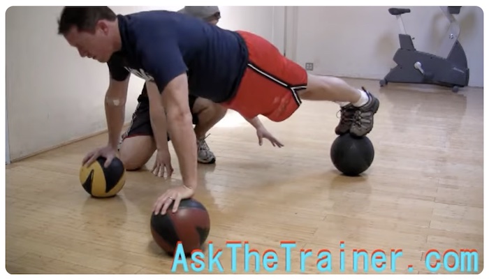 Do push-ups with 3 medicine balls: two for your hands and one for your feet. [ID: pushup_3balls]