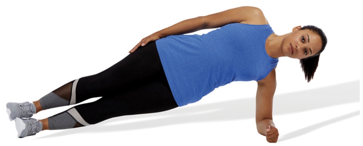 VeryWellFit: "The side plank is an excellent exercise for strengthening the oblique abdominal muscles, which don't get worked as much during ab exercises such as crunches. Hold your body on your side in a straight position supported only by one arm and the side of one foot." [ID: side_plank]