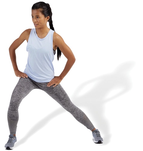 This exercise stretches the hip adductor muscles of the inner thigh. [ID: standing_adductor]