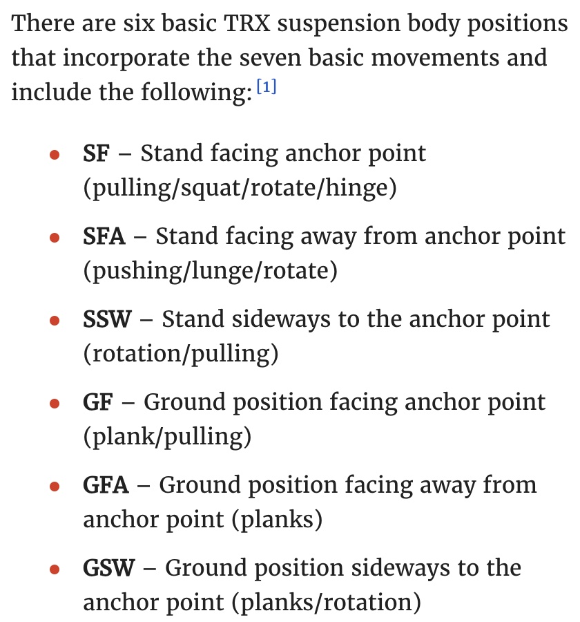 The six TRX body positions are explained here by VeryWellFit.