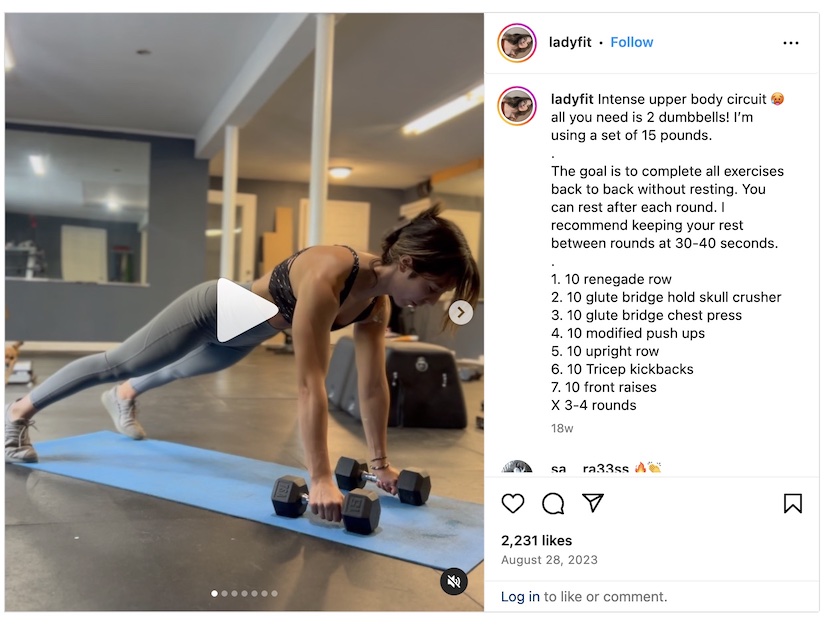 This is an "intense upper body" workout with 2 dumbbells from Instagram. [ID: workout41]